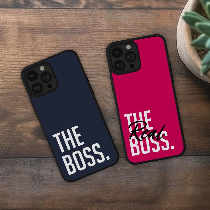 „THE BOSS, THE REAL BOSS” etui na telefon dla par, z niebieskim i różowym tłem, męska wersja